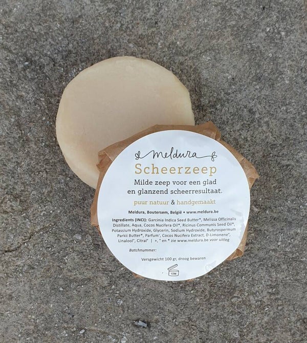 De scheerzeep zelf bevat kokosmelk, citroenmelisse hydrolaat en zeer veel kokum boter. Citroenmelisse hydrolaat helpt wondjes sneller te genezen en het verzacht. Kokum boter herstelt de elasticiteit van de huid en verzacht. Wij verwerken kokum boter in onze scheerzeep omwille van het hoge gehalte aan stearinezuur, want het zorgt voor een dens, stabiel, romig schuim. Kokosmelk geeft deze scheerzeep dan weer een hydraterend karakter en een uitbundig schuim.